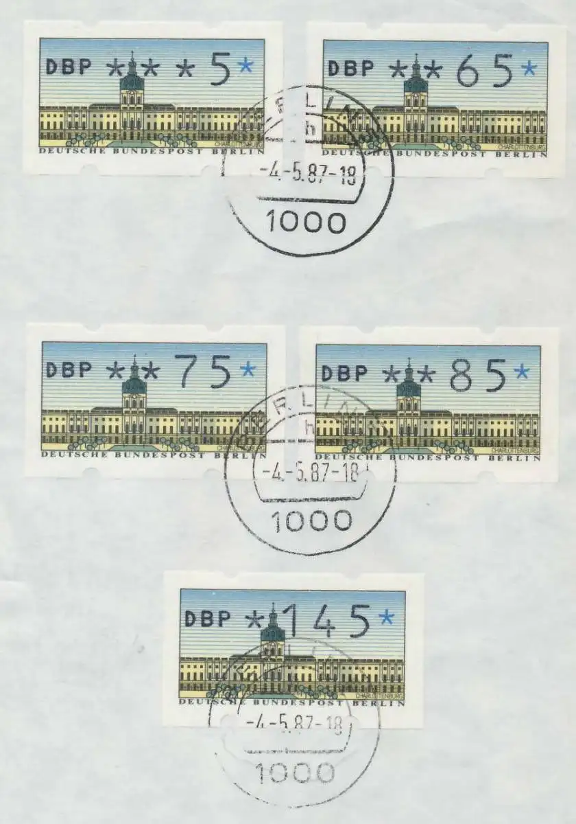 ATM-Ausgabe von 1987 Versandstellen Satz VS2, mit Berlin Tagesstempel vom Ersttag auf kleinem Blatt