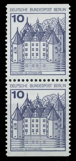 010 Pfg Wert aus der Berlin-Dauerserienausgabe Burgen und Schlösser, oben und unten geschnitten aus Markenheftchen als senkrechtes Paar, gelbliche Floureszenz (MichelNr.: 532C/D)