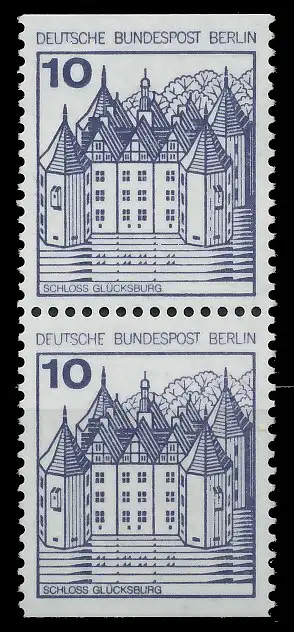 010 Pfg Wert aus der Berlin-Dauerserienausgabe Burgen und Schlösser, oben und unten geschnitten aus Markenheftchen als senkrechtes Paar, grünliche Floureszenz (MichelNr.: 532C/D)