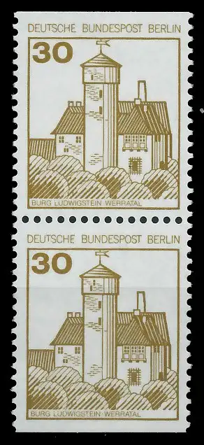 030 Pfg Wert aus der Berlin-Dauerserienausgabe Burgen und Schlösser, oben und unten geschnitten aus Markenheftchen als senkrechtes Paar, grünliche Floureszenz (MichelNr.: 534C/D)