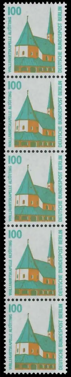 100 Pfg Wert aus der Berlin-Dauerserienausgabe Sehenswürdigkeiten als 5er Streifen, ein Wert mit rückseitiger Nummer 010