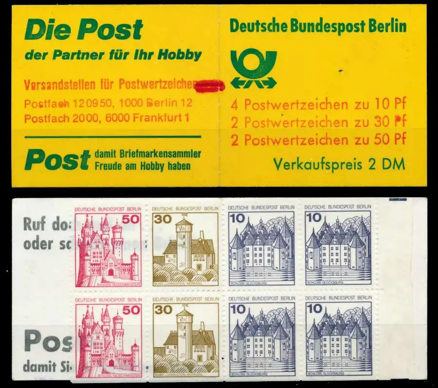 Berlin Burgen und Schlösser Markenheftchen 10 (50+30+10+10), billigste Sorte, Abstand Posthorn 5mm, Deckel schon etwas abgegriffen