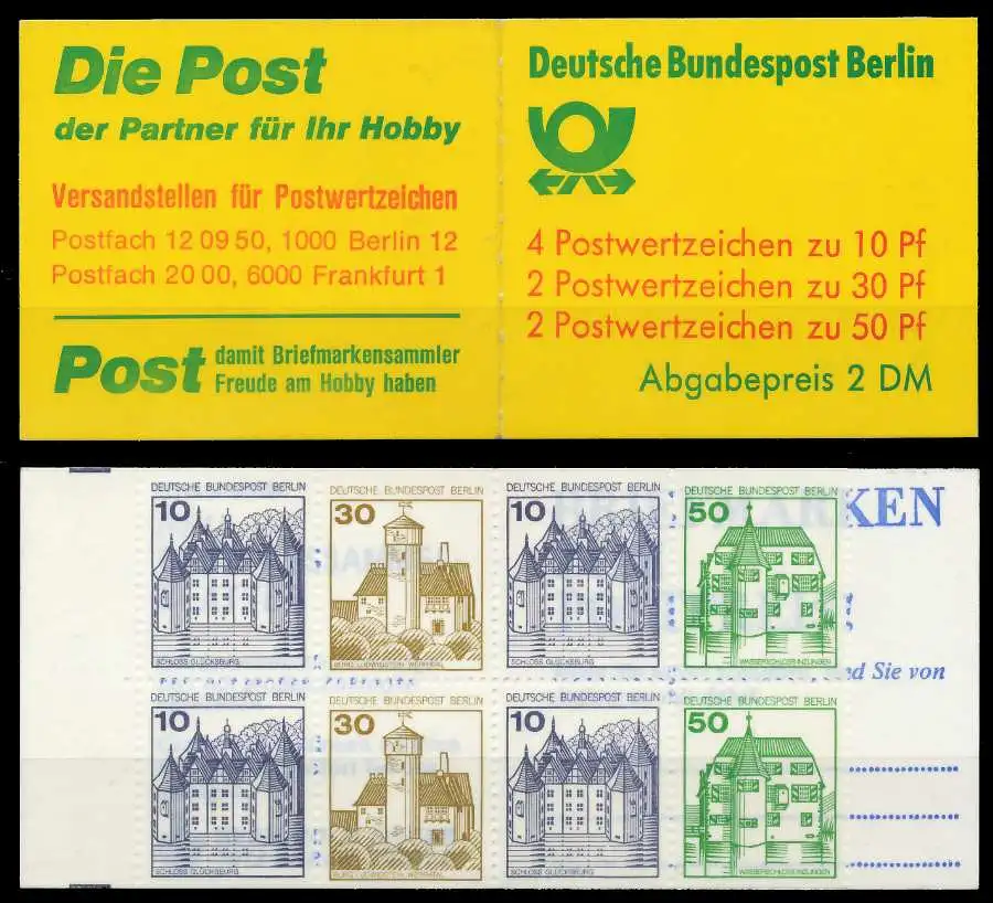 Berlin Burgen und Schlösser Markenheftchen 11 (10+30+10+50), Reklame Sieger ETB / Briefmarken zum Postpreis, "r" in Postwertzeichen höherstehend