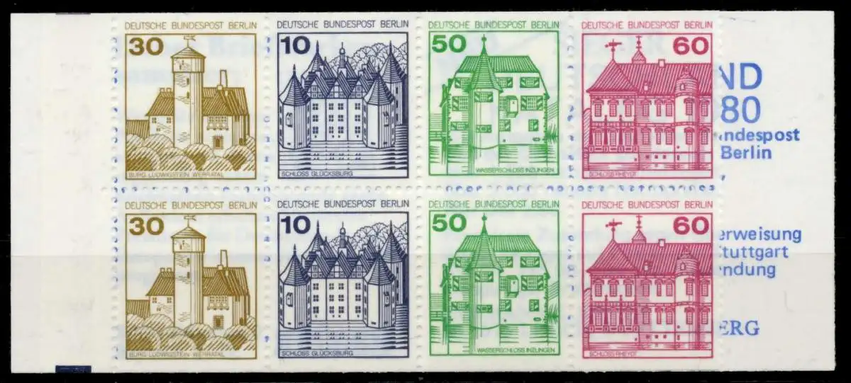 Berlin Burgen und Schlösser Markenheftchen 12a (30+10+50+60), Originalabbildung des Heftchenblattes. Die grauen Schnittbalken sind durch die Einfärbung des Hintergrundes teilweise geschwärzt (also keine Besonderheit)