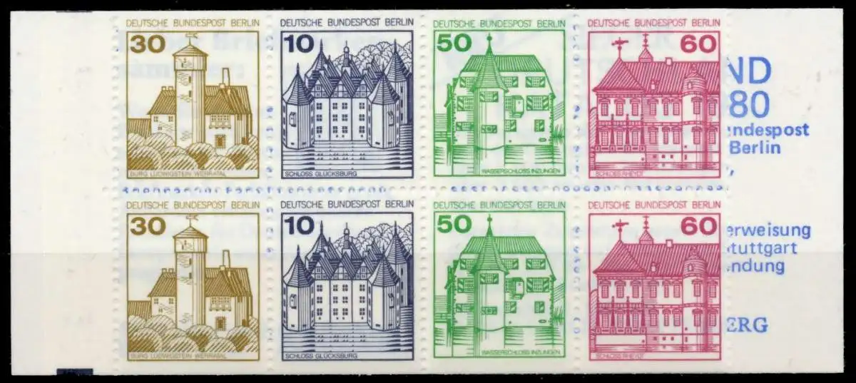 Berlin Burgen und Schlösser Markenheftchen 12a (30+10+50+60), Originalabbildung des Heftchenblattes. Die grauen Schnittbalken sind durch die Einfärbung des Hintergrundes teilweise geschwärzt (also keine Besonderheit)