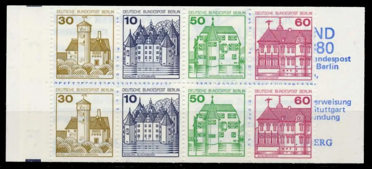 Berlin Burgen und Schlösser Markenheftchen 12a (30+10+50+60), Originalabbildung des Heftchenblattes. Die grauen Schnittbalken sind durch die Einfärbung des Hintergrundes teilweise geschwärzt (also keine Besonderheit)