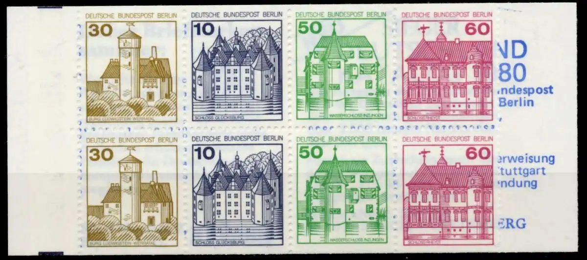 Berlin Burgen und Schlösser Markenheftchen 12a (30+10+50+60), Originalabbildung des Heftchenblattes. Die grauen Schnittbalken sind durch die Einfärbung des Hintergrundes teilweise geschwärzt (also keine Besonderheit)