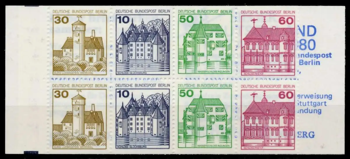 Berlin Burgen und Schlösser Markenheftchen 12a (30+10+50+60), Originalabbildung des Heftchenblattes. Die grauen Schnittbalken sind durch die Einfärbung des Hintergrundes teilweise geschwärzt (also keine Besonderheit)