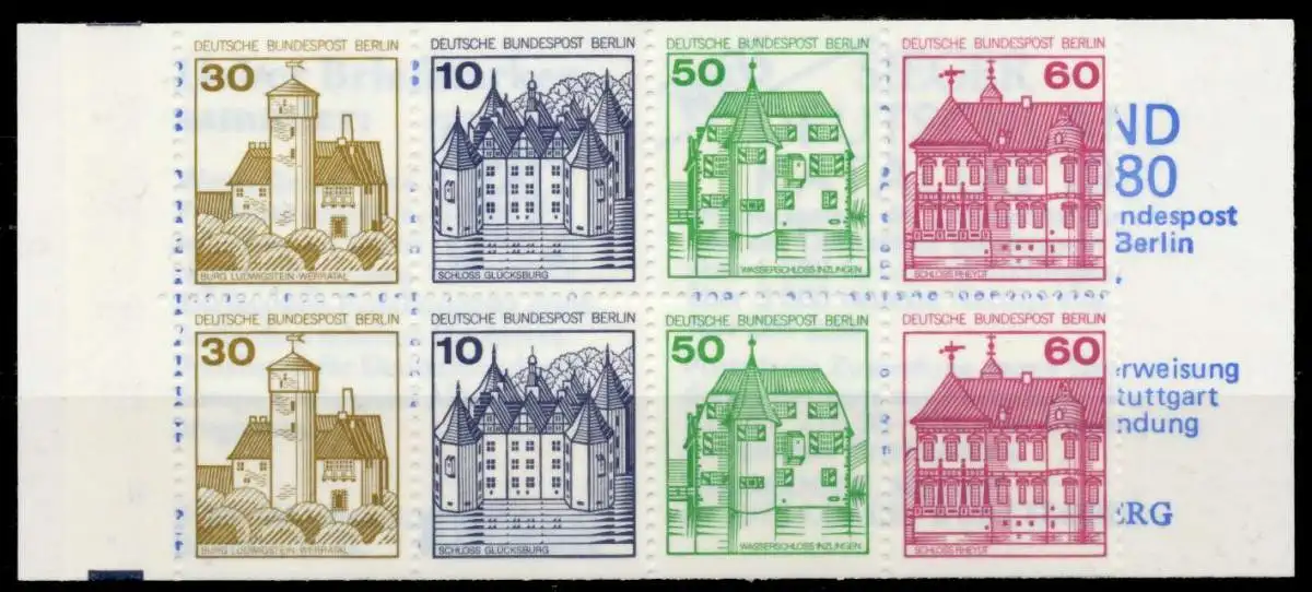 Berlin Burgen und Schlösser Markenheftchen 12a (30+10+50+60), Originalabbildung des Heftchenblattes. Die grauen Schnittbalken sind durch die Einfärbung des Hintergrundes teilweise geschwärzt (also keine Besonderheit)