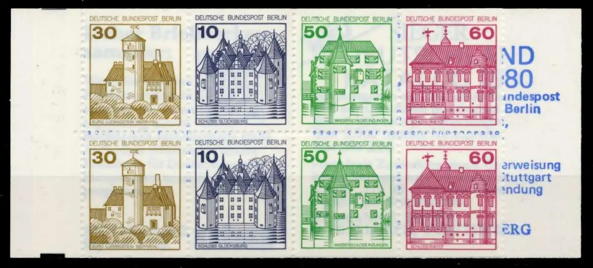 Berlin Burgen und Schlösser Markenheftchen 12a (30+10+50+60), Originalabbildung des Heftchenblattes. Die grauen Schnittbalken sind durch die Einfärbung des Hintergrundes teilweise geschwärzt (also keine Besonderheit)