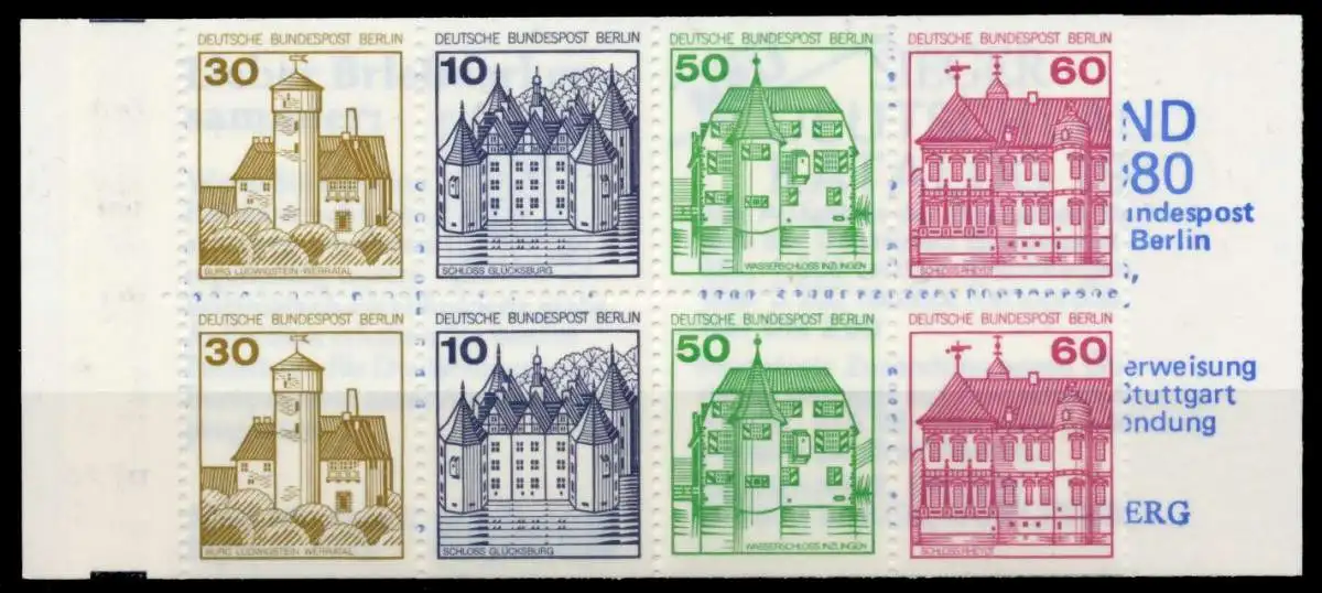 Berlin Burgen und Schlösser Markenheftchen 12a (30+10+50+60), Originalabbildung des Heftchenblattes. Die grauen Schnittbalken sind durch die Einfärbung des Hintergrundes teilweise geschwärzt (also keine Besonderheit)