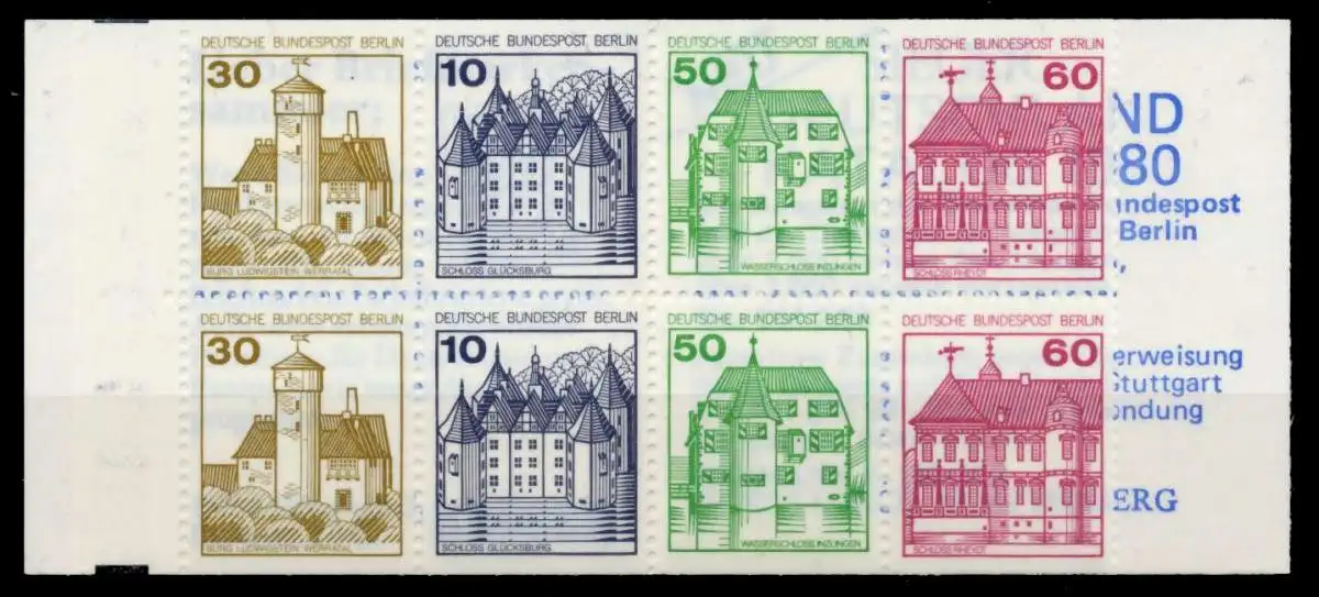 Berlin Burgen und Schlösser Markenheftchen 12a (30+10+50+60), Originalabbildung des Heftchenblattes. Die grauen Schnittbalken sind durch die Einfärbung des Hintergrundes teilweise geschwärzt (also keine Besonderheit)