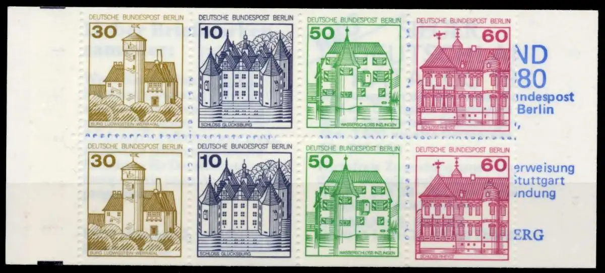 Berlin Burgen und Schlösser Markenheftchen 12a (30+10+50+60), Originalabbildung des Heftchenblattes. Die grauen Schnittbalken sind durch die Einfärbung des Hintergrundes teilweise geschwärzt (also keine Besonderheit)