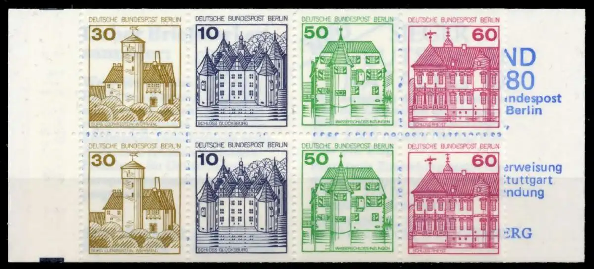 Berlin Burgen und Schlösser Markenheftchen 12a (30+10+50+60), Originalabbildung des Heftchenblattes. Die grauen Schnittbalken sind durch die Einfärbung des Hintergrundes teilweise geschwärzt (also keine Besonderheit)