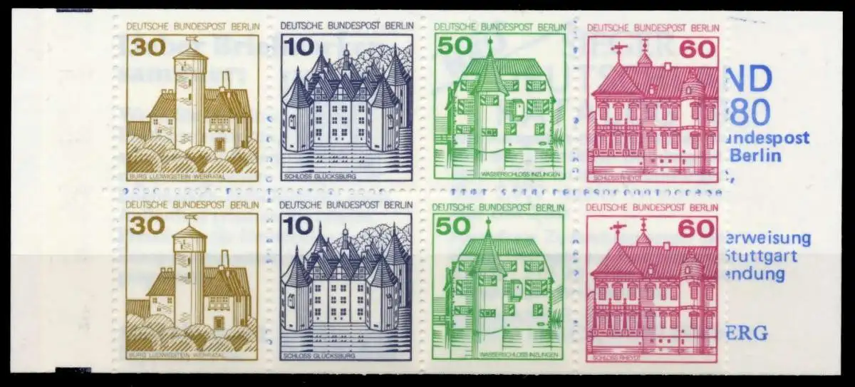Berlin Burgen und Schlösser Markenheftchen 12a (30+10+50+60), Originalabbildung des Heftchenblattes. Die grauen Schnittbalken sind durch die Einfärbung des Hintergrundes teilweise geschwärzt (also keine Besonderheit)