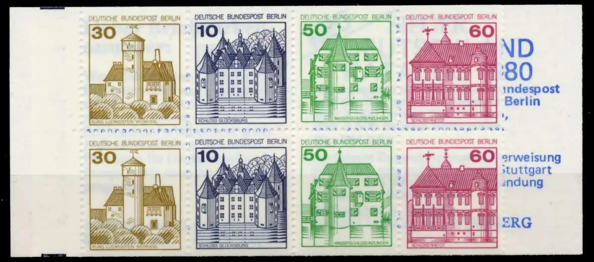 Berlin Burgen und Schlösser Markenheftchen 12a (30+10+50+60), Originalabbildung des Heftchenblattes. Die grauen Schnittbalken sind durch die Einfärbung des Hintergrundes teilweise geschwärzt (also keine Besonderheit)