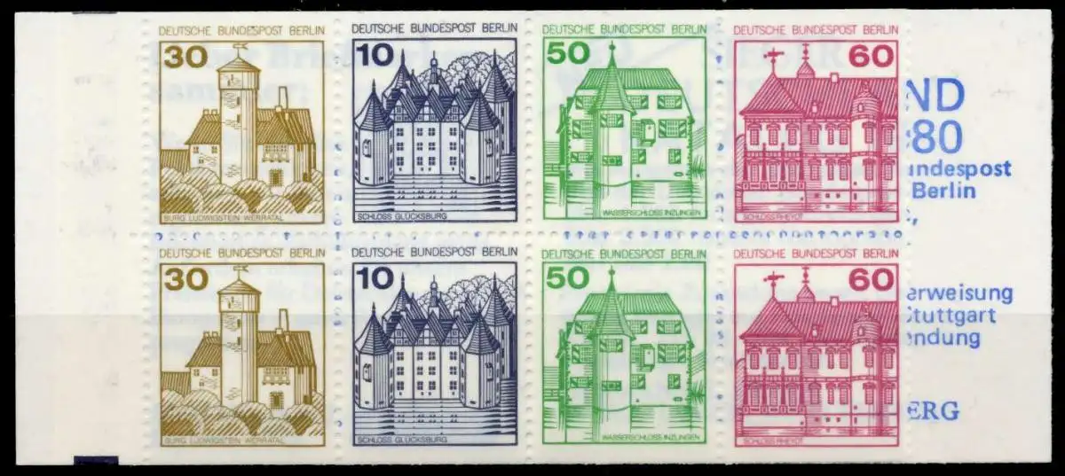 Berlin Burgen und Schlösser Markenheftchen 12a (30+10+50+60), Originalabbildung des Heftchenblattes. Die grauen Schnittbalken sind durch die Einfärbung des Hintergrundes teilweise geschwärzt (also keine Besonderheit)