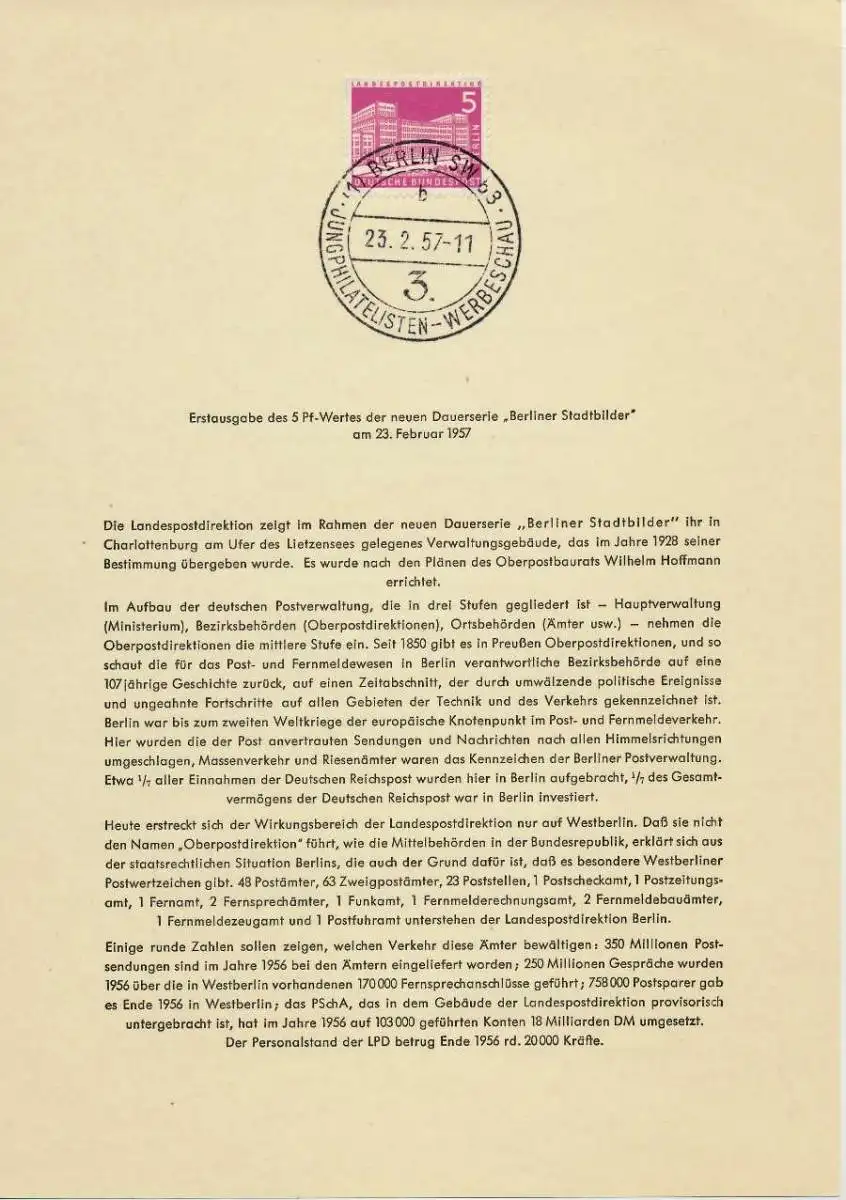5 Pfg Wert aus der 2. Ausgabe Berliner Stadtbilder, Ersttagsblatt Vorläufer-Ausgabe