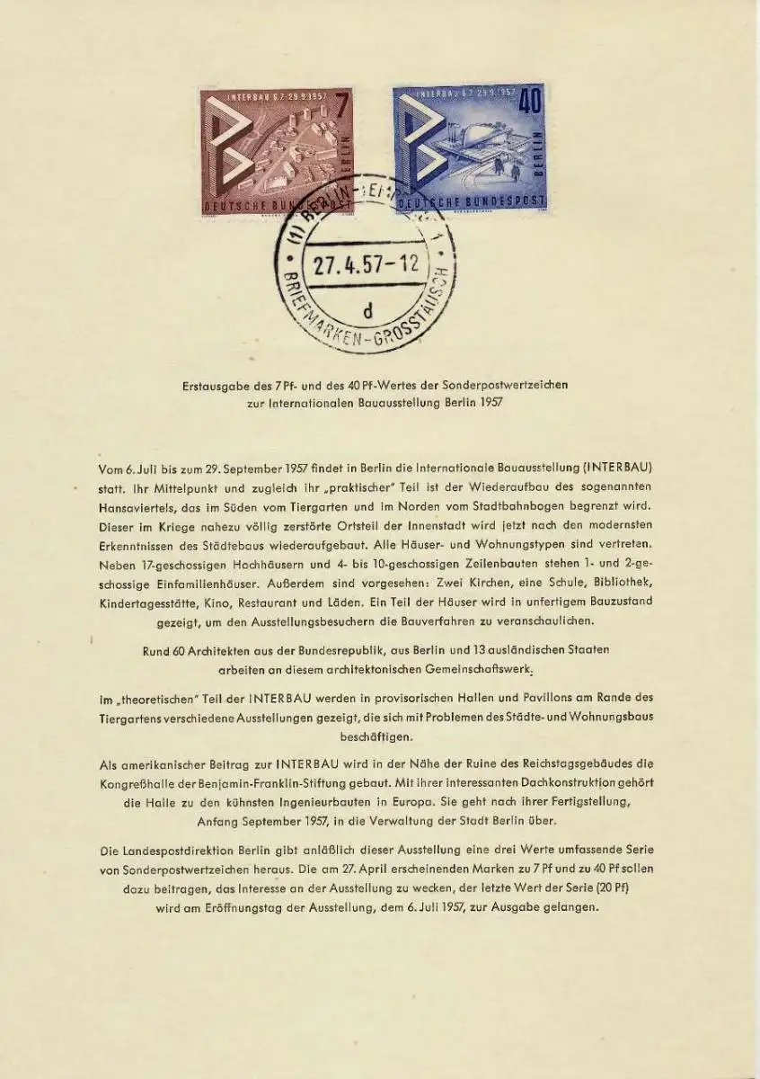 7 Pfg u. 40 Pfg Wert aus der Ausgabe Interbau, Ersttagsblatt Vorläufer-Ausgabe