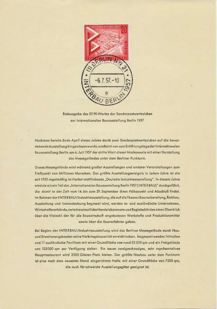 20 Pfg Wert aus der Ausgabe Interbau, Ersttagsblatt Vorläufer-Ausgabe