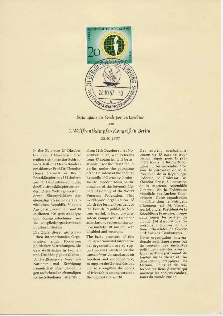 20 Pfg Wert aus der Ausgabe Welt-Frontkämpfer-Kongress, Ersttagsblatt Vorläufer-Ausgabe