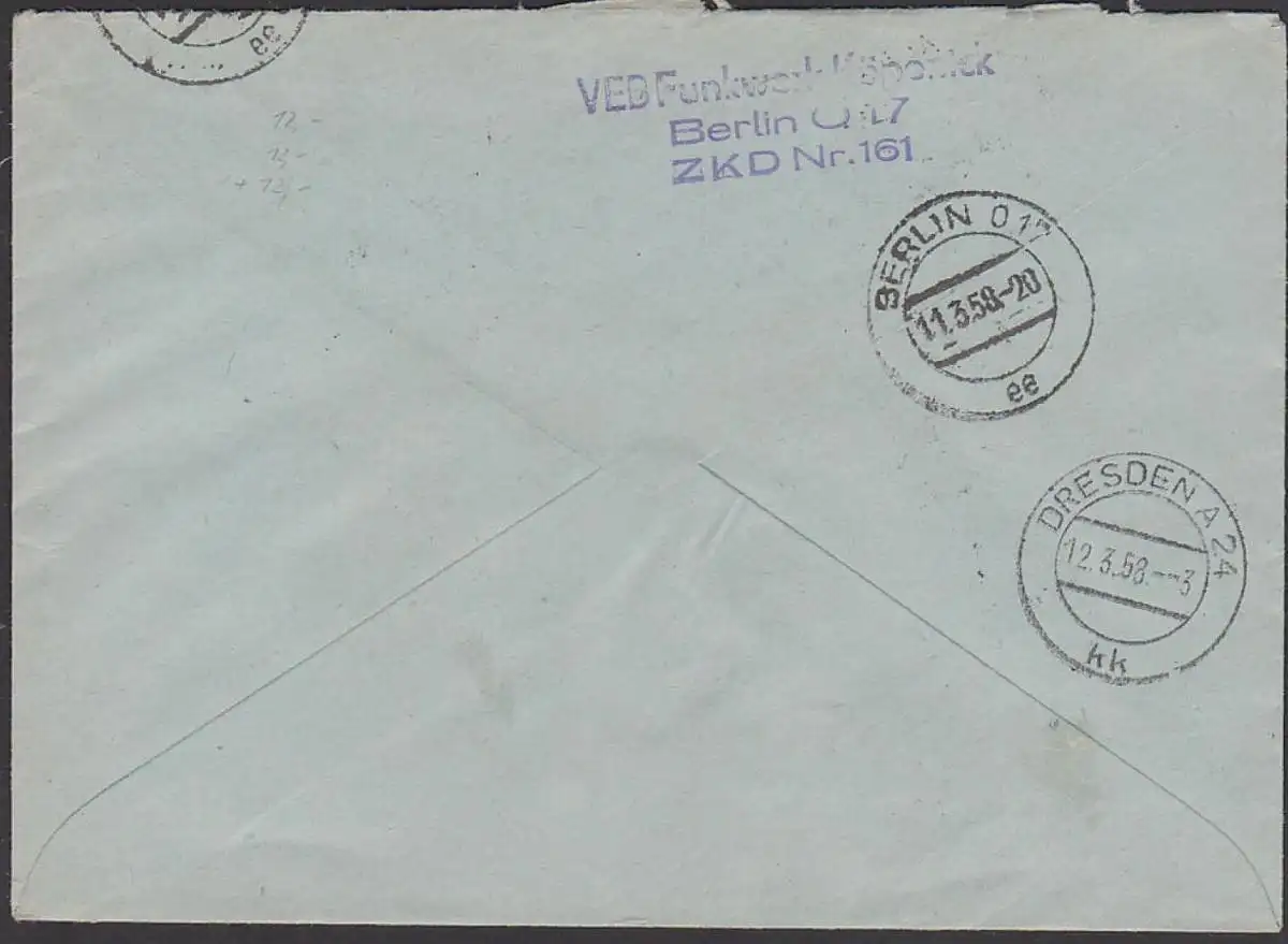 BERLIN O17 DDR ZKD B16L 10Pf. Wertstreifen als MeF 11.3.58,VEB Funkwerk Köpenick, ZKD-Nr. 161