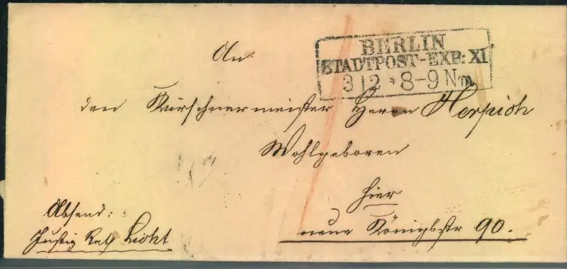 BERLIN STADTPOST-EXP: XI, schwarzer Ra2 auf kleinem markenlosen Ortsbrief
