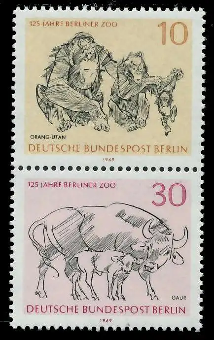 Senkrechter Zusammendruck 10+30 Pfg aus der Blockausgabe 125 Jahre Berliner Zoo (MichelNr.: 1023, 338, 340)