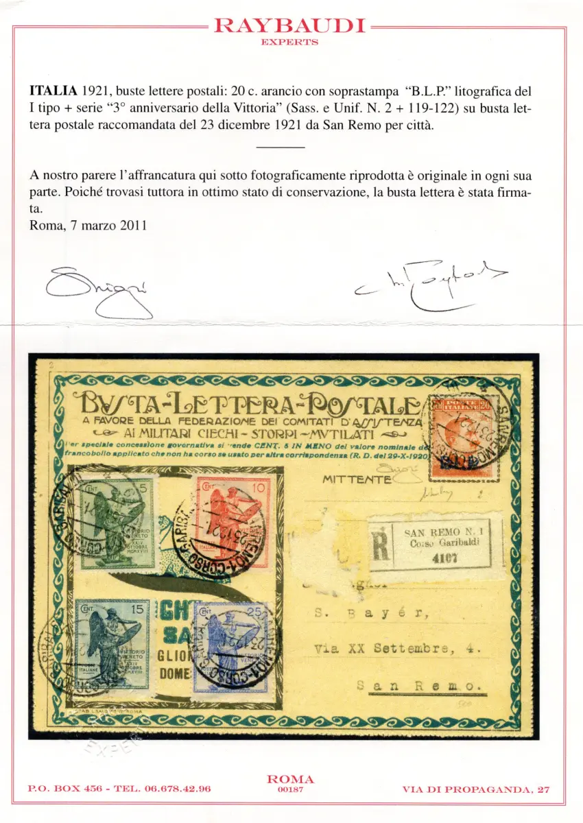 B.L.P. Cent. 20 Nr. 2 auf Briefumschlag gereist Racc. von San Remo in die Stadt am 23.12.21 serienseitig kpl. Vittoria (Nr. 119/122) - Umschlag mit leichtem Defekt auf der Rückseite - perfekte Briefmarke - Selten - Zert. Ray. - Kat. euro 1.500 n. 207/20