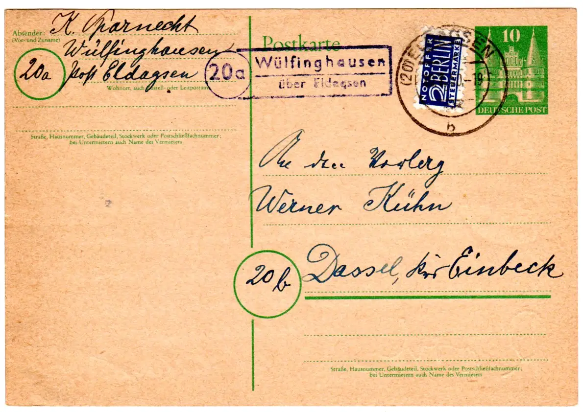 BRD 1950, Landpost Stpl. 20a WÜLFINGHAUSEN über Eldagsen auf 10 Pf. Ganzsache