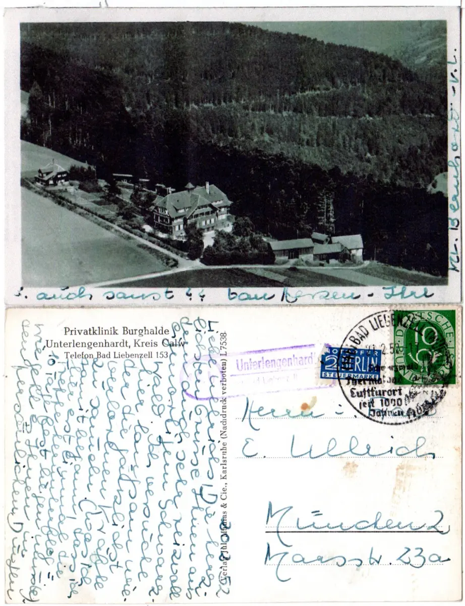 Poststellen II-Stempel auf Privatklinik Burghalden sw-AK m. 10 Pf.