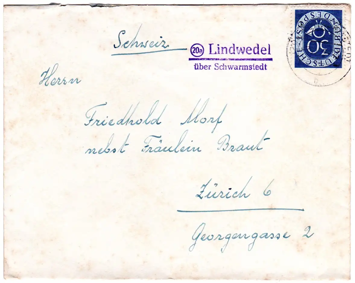 BRD 1953, Landpost Stpl. 20a LINDWEDEL über Schwarmstedt auf Brief m. 30 Pf.