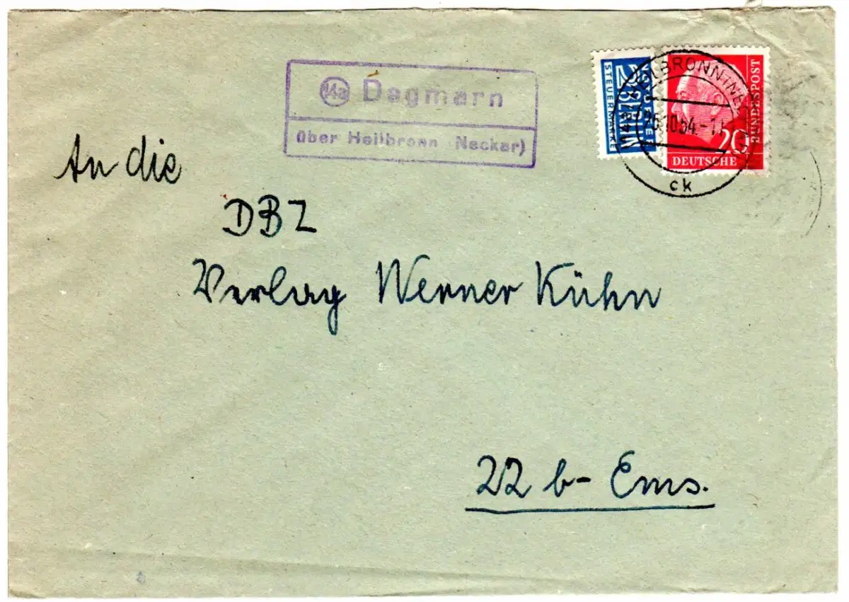 BRD 1954, Landpost Stpl. 14a DEGMARN über Heilbronn (Neckar) auf Brief m. 20 Pf.