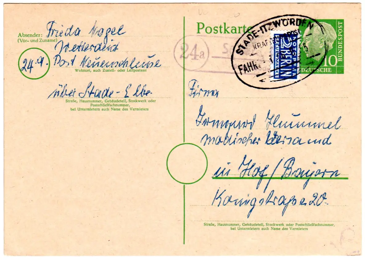 BRD 1955, Landpost Stpl. 24a SÜDERDEICH über Stade auf Ganzsache m. Bahnpoststpl