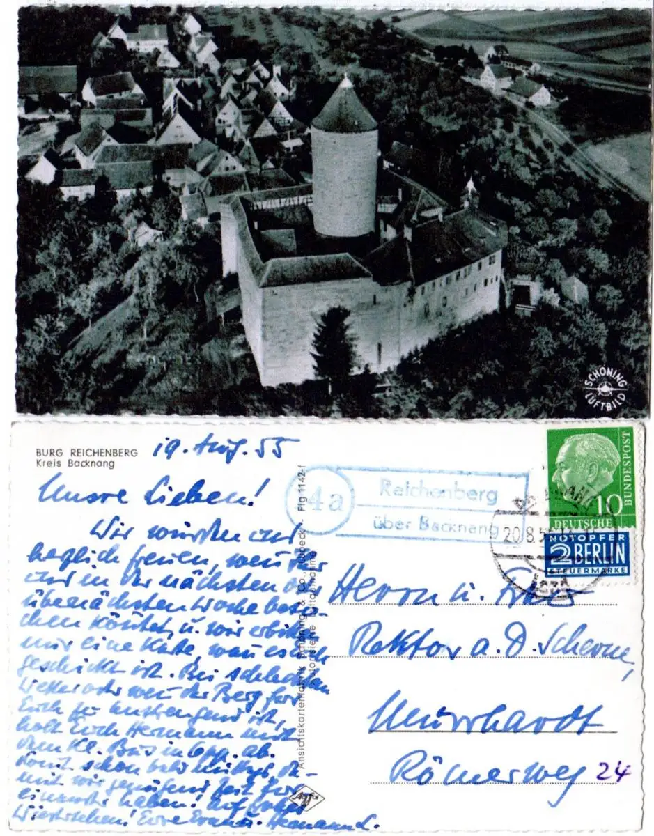BRD 1955, Landpost Stpl. REICHENBERG über Backnang auf AK m. 10 Pf.