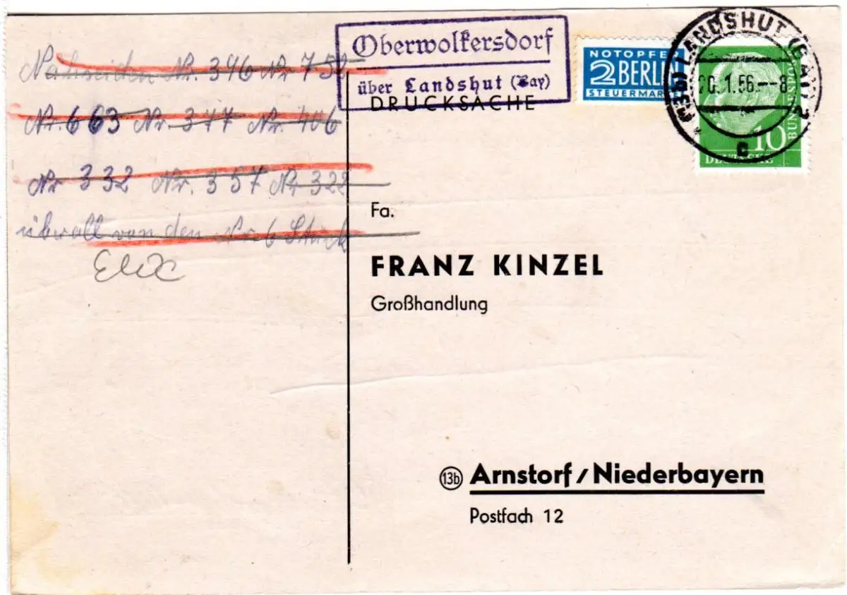 BRD 1956, Landpost Stpl. OBERWOLKERSDORF über Landshut klar auf Karte m. 10 Pf.