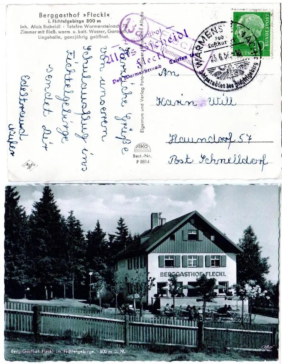 BRD 1956, Landpoststpl. 13a FLECKL über Warmensteinach auf Gasthof-AK m. 10 Pf.