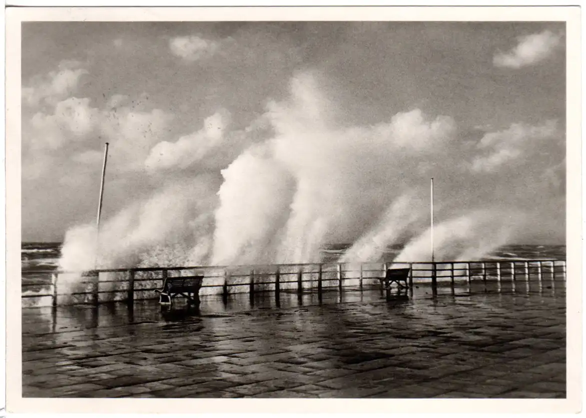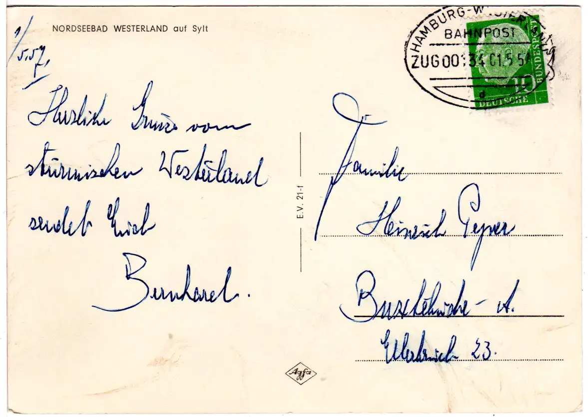 BRD 1957, Bahnpost Hamburg-Westerland klar auf Sylt sw-AK m. 10 Pf.