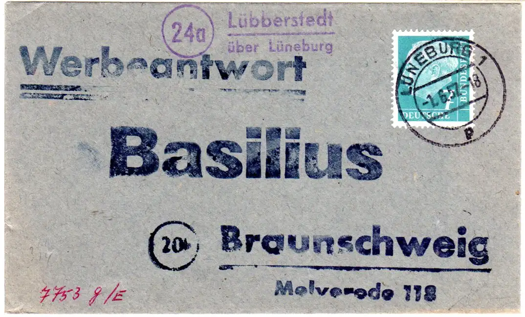 BRD 1957, Landpost Stempel 24a LÜBBERSTEDT über Lüneburg auf Werbeantwort Brief