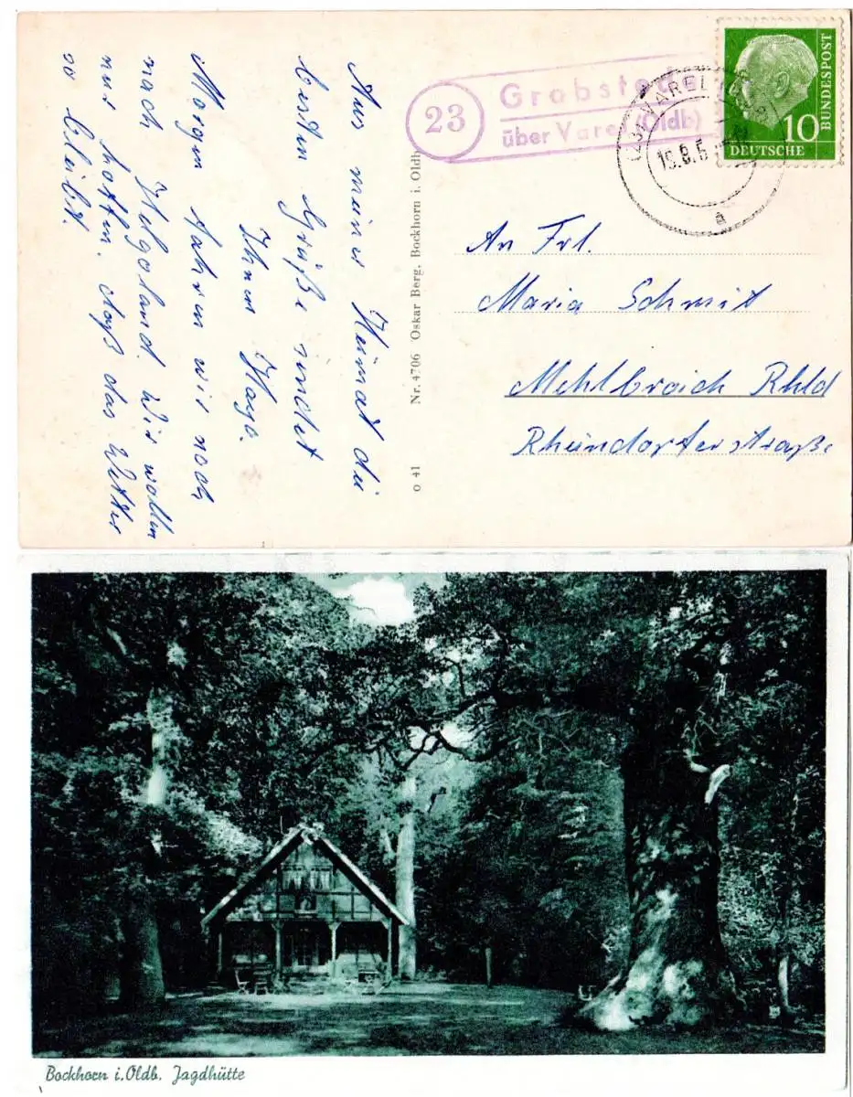 BRD 1957, Landpost Stpl. 23 GRABSTEDE über Varel auf Bockhorn Jagdhütte sw-AK