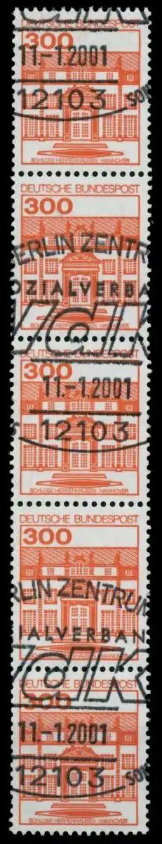 300 Pfg Wert aus der Ausgabe Burgen und Schlösser, 5er Streifen, Letterset, mit rückseitiger Nummer 300