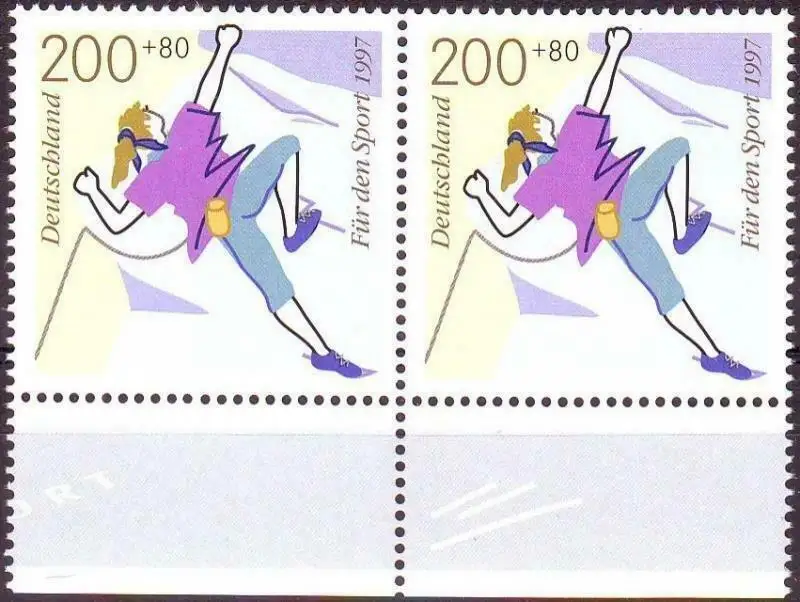 • MichSeite BRD: MiNr. 1901, 04.02.1997, "Sporthilfe: Fun-Sport", Plattenfehler I, postfrisch Beschreibung \nAusgabeland: Bundesrepublik Deutschland \nAusgabeanlass: Briefmarkenausgabe "Sporthilfe: Fun-Sport" Katalognummer: MiNr. 1901, Plattenfehler I "verlängerte Daumenlinie in der oberen Faust" Ausgabedatum: 04.02.1997 Nominale: Wert zu 2,00 + 0,80 DM \nErhaltung: postfrisch