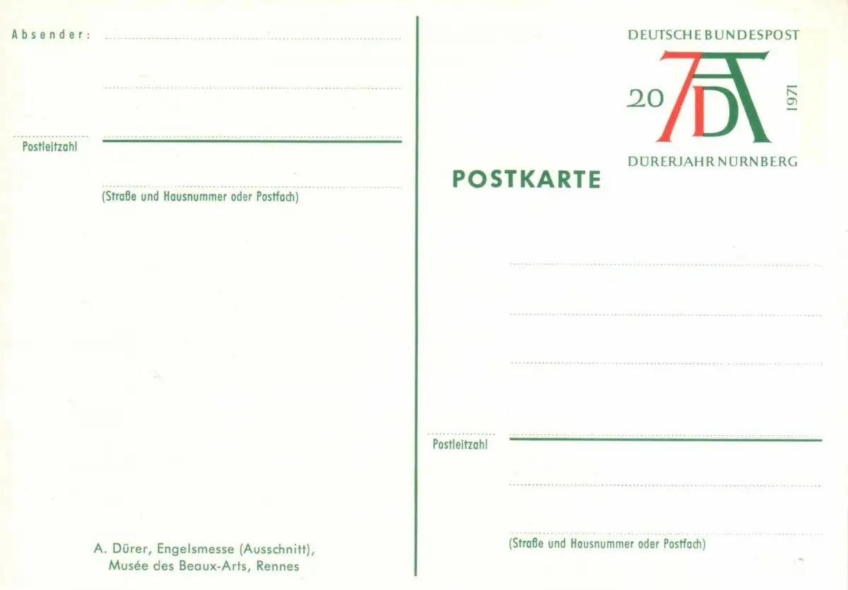 Beschreibung \nAusgabeland: Bundesrepublik Deutschland \nAusgabeanlass: Ganzsachenausgabe "Albrecht Dürer" Katalognummer: MiNr. PSo 3/04 Ausgabedatum: 21.05.1971 Nominale: 0,20 DM \nTyp: Bild: Engelsmesse \nErhaltung: Ganzsache (Postkarte), ungebraucht Zudruck: - \nHinweis: -