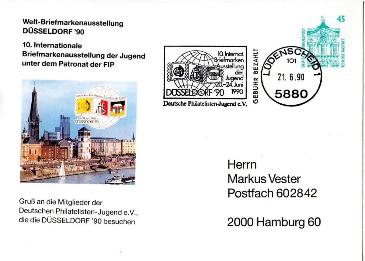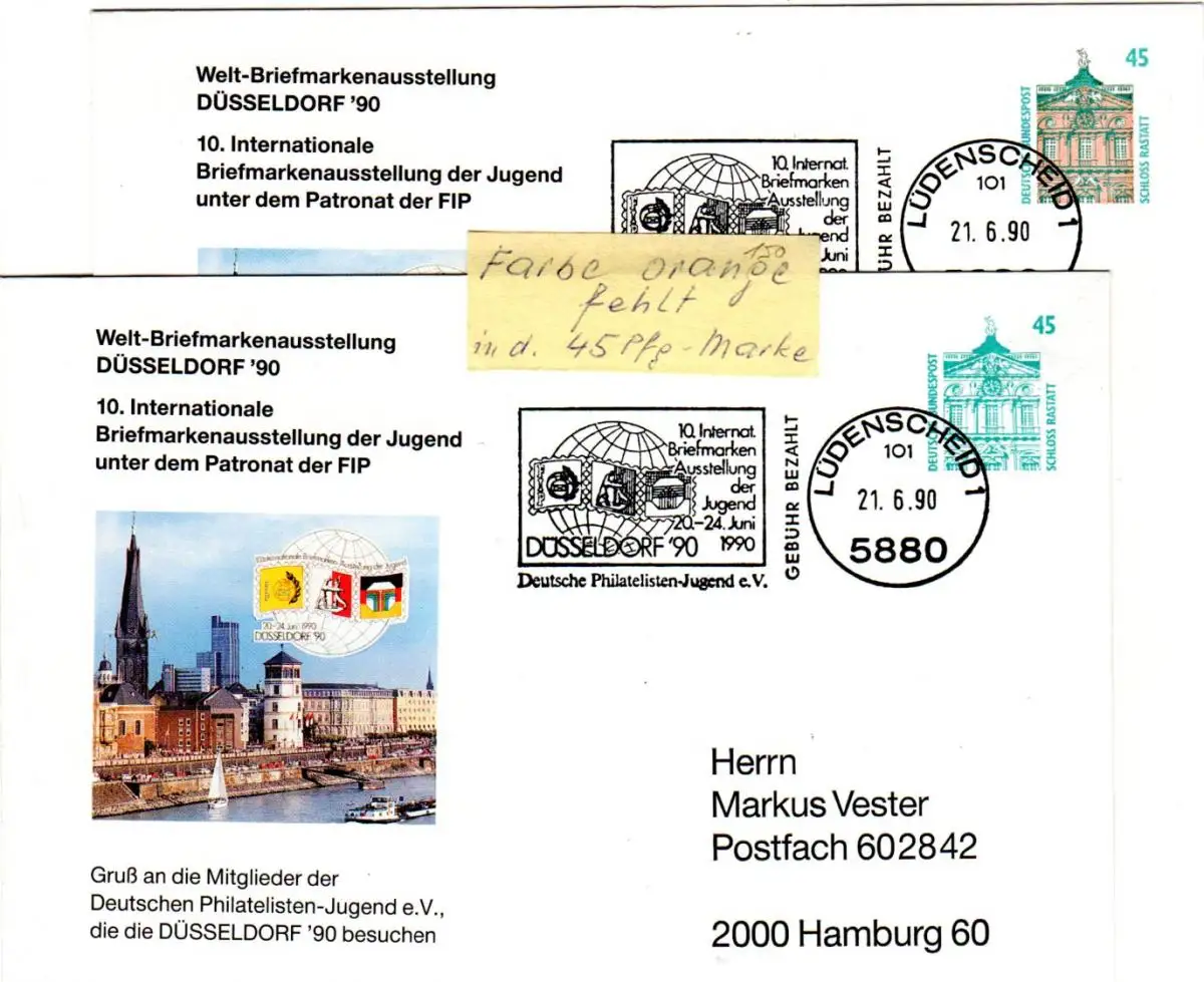 Sauber m. entsprechendem Sonderstempel Lüdenscheid gebrauchter Privatganzsachenumschlag zu Welt-Briefmarkenausstellung DÜSSELDORF ´90. Wertstempel ohne Druckfarbe orange! Zum Vergleich entsprechender Umschlag ohne Druckfehler. Seltener Fehldruck!!!
