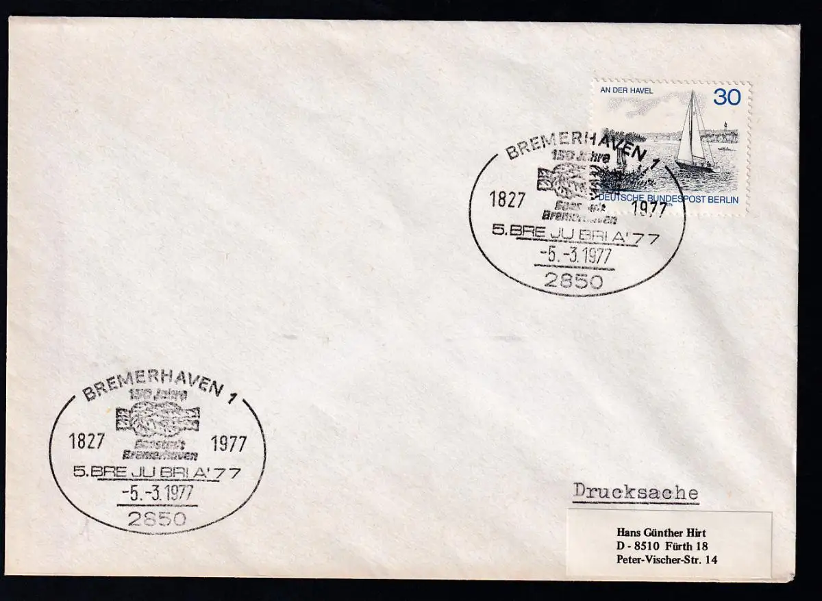 BREMERHAVEN 1 2850 150 Jahre Seestadt Bremerhaven 5. BREJUBRUA' 77 5.3.1977 auf brief