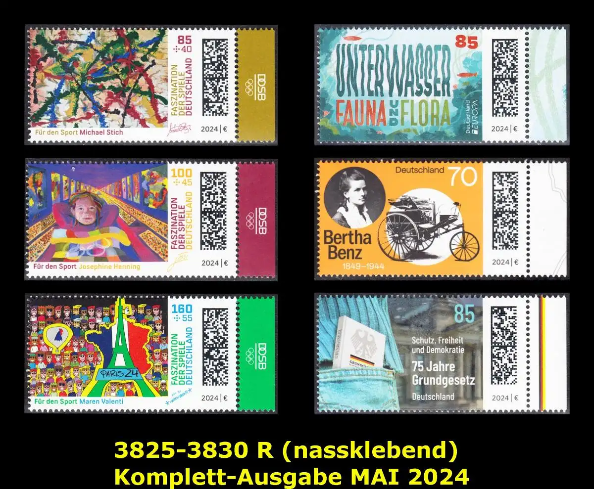 BUND 2024 Michel-# 3825-3830 postfrisch 6 EINZELMARKEN RÄNDER rechts (GESAMTAUSGABE MAI 2024)