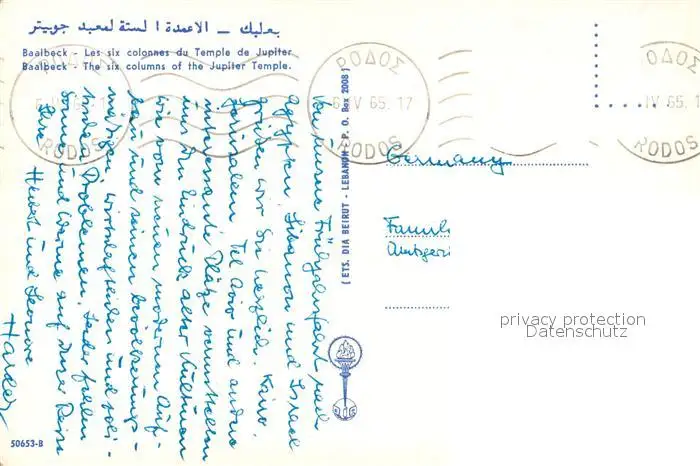 Baalbeck The six columns of the Jupiter Temple Baalbeck postalisch gelaufen 1965 Erhaltung siehe scans [FriedD77] Frierer