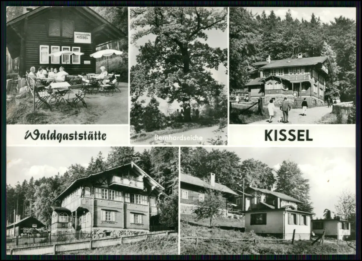 Bad Liebenstein im Thüringer Wald – historische Mehrbild-Darstellung der Waldgaststätte Kissel mit Bernhardseiche. Originale DDR-Fotopostkarte (Auslese-Bild-Verlag Bad Salzungen, Echt Foto, ca. 1980). Typische Architektur des Thüringer Waldes, beliebtes Ausflugsziel in der Nähe von Bad Liebenstein. Bad Liebenstein als ältester Kurort Thüringens mit Tradition seit dem 16. Jh.) Rückseite: unbeschrieben, sauber, Verlag und Preisangabe „DDR 0,25 M“.