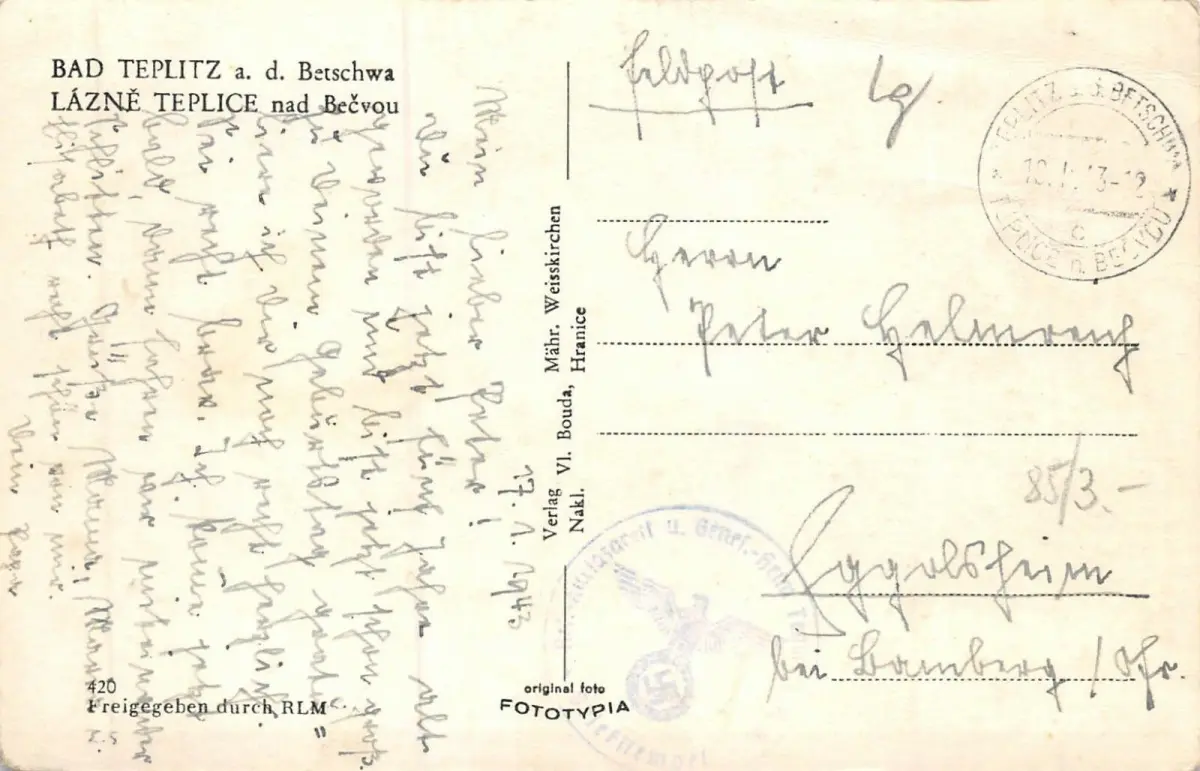 Bad Teplitz a. d. Betschwa Feldpostkarte AK 1943