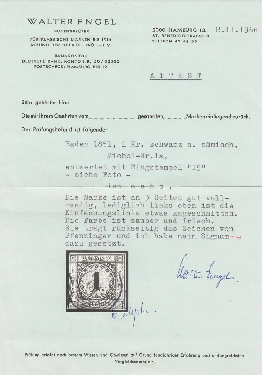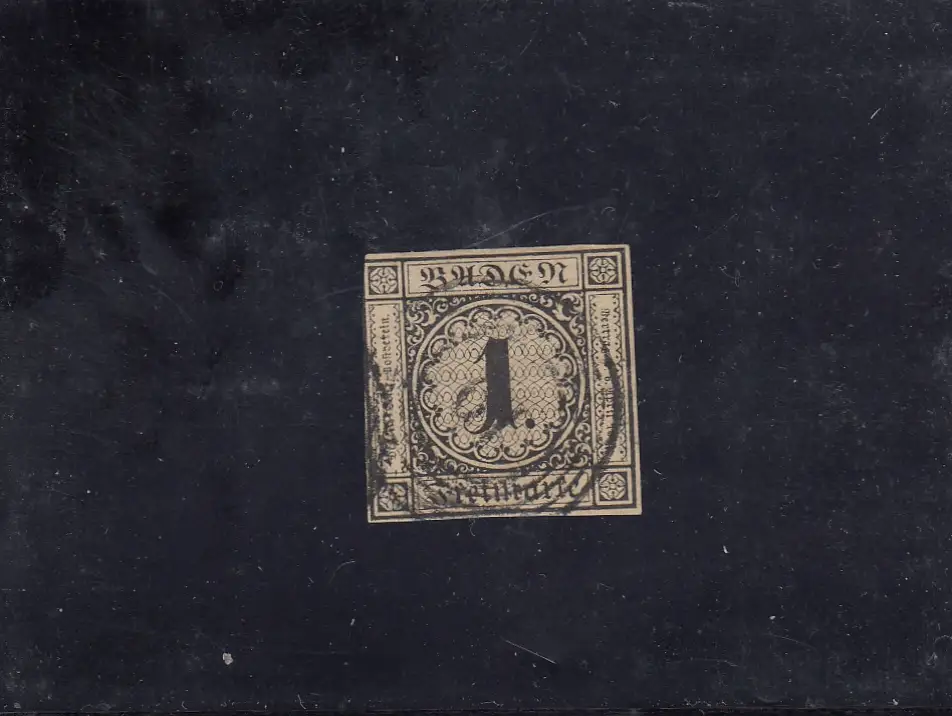Baden: MiNr. 1a, gestempelt Ringstempel 19, altes BPP Attest